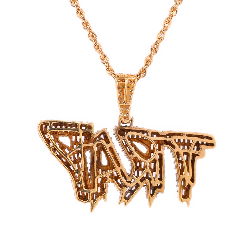 Unveil bold sophistication with our 10k Yellow Gold Men's Pendant adorned with 1.57ct of mesmerizing baguette diamonds and featuring the word "TRAP". Meticulously crafted, this pendant exudes urban elegance and contemporary style, making a statement piece for modern gentlemen. The distinctive design and exquisite diamonds elevate its appeal, perfect for adding a touch of edgy refinement to any ensemble. Embrace the fusion of luxury and street culture with this remarkable pendant, reflecting individuality and urban charm with every wear.