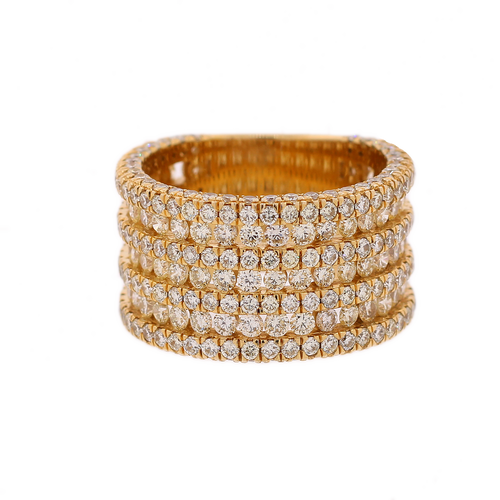Crafted in lustrous 10K yellow gold, this remarkable men's band features a magnificent display of luxury with its three-row prong-set diamonds totaling 5.49 carats. The brilliance of the diamonds is accentuated by the precision of the prong setting, ensuring maximum light reflection and sparkle. This statement piece exudes sophistication and style, making it a symbol of strength and elegance for the modern man. Whether as a wedding band or a fashion statement, this ring embodies timeless allure and masculine charm. Elevate your look with this stunning accessory that adds a touch of refinement to any ensemble.