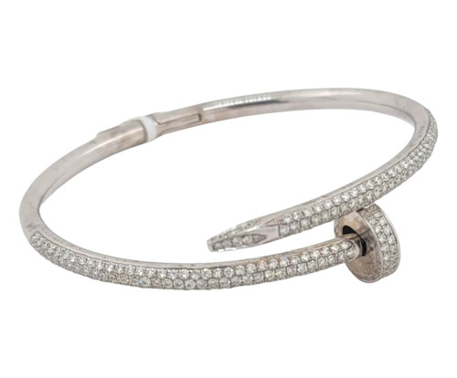 This striking custom bangle is crafted from 10 karat white gold and adorned with 2.50 carats of dazzling diamonds. The unique nail-style design offers a modern and edgy twist on classic jewelry, making it a standout piece. Ideal for those who appreciate bold and contemporary fashion, this bangle combines innovative design with luxurious sparkle, creating a truly remarkable accessory for any occasion.